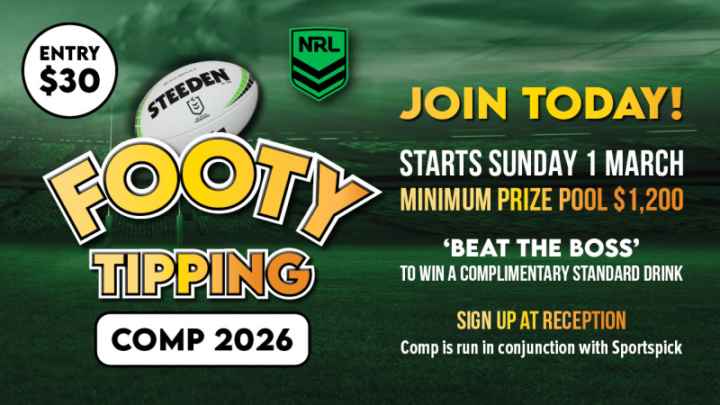 Competition will cost $30 for members and the minimum prize pool is $1,200. Simply see reception to pay your $30 and join. Plus ‘Beat the Boss’, where you can WIN a complimentary standard drink every week. Tippers will need to come into the Club and place their tips weekly.