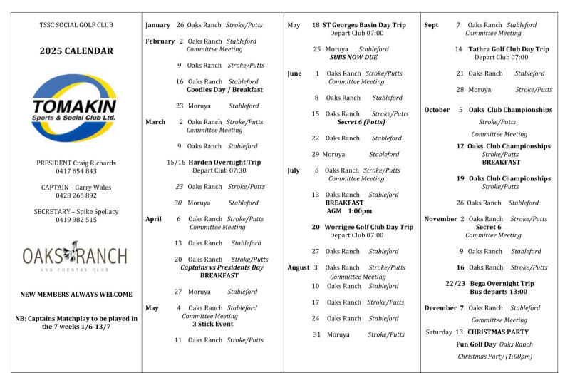 The current Calendar (see below) includes The Captains vs Presidents challenge, the Captains Matchplay and Annual Club Championship.
